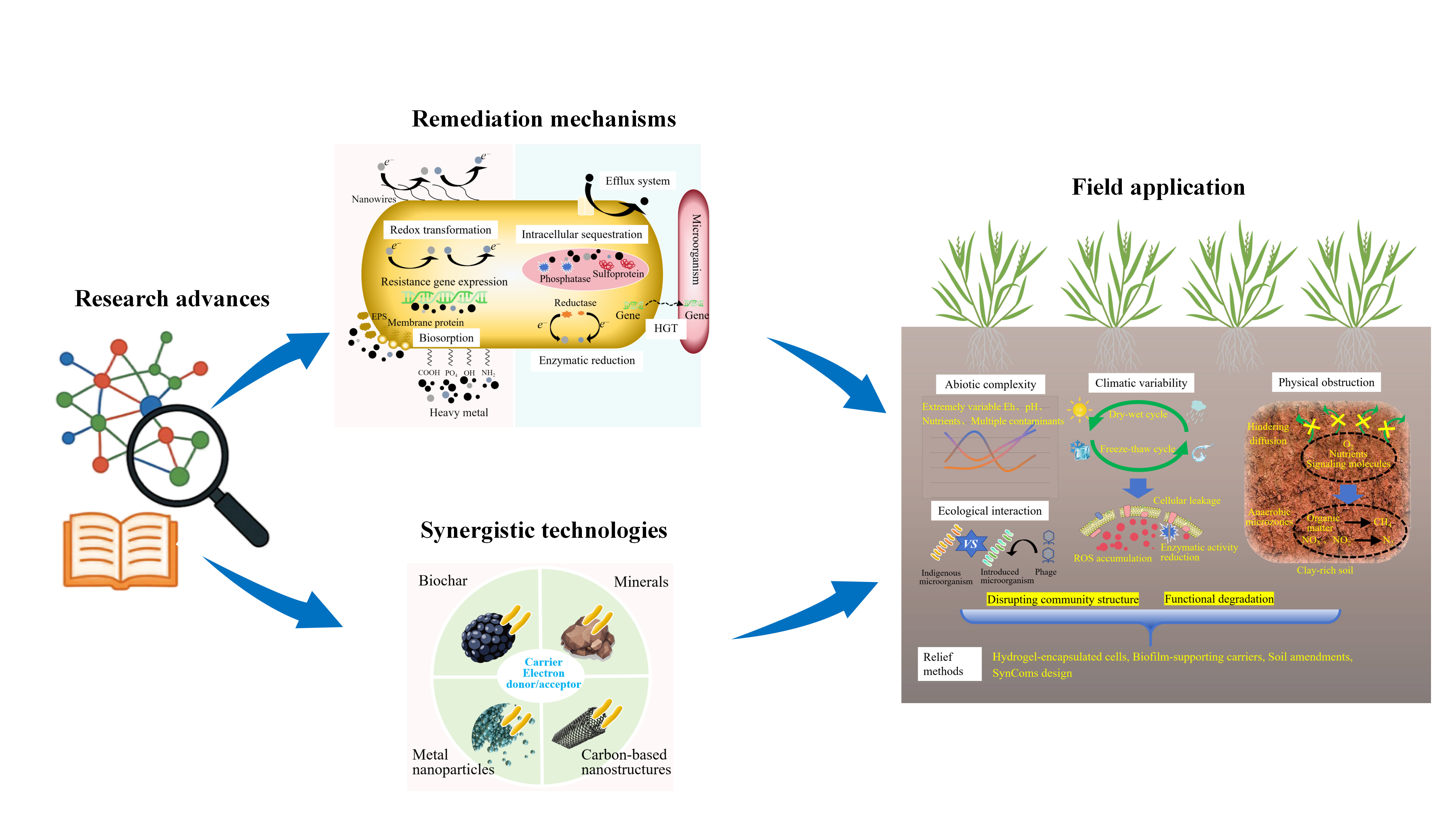 - Research over the past three decades has progressed from single-microbe experiments toward multidisciplinary integration and from laboratory-scale to large-area field deployment. Representative cases (such as SRB in paddy fields and plant growth promoting bacteria in tea plantations) demonstrate the cost-effectiveness and practicability of microbial remediation in real-world engineering.