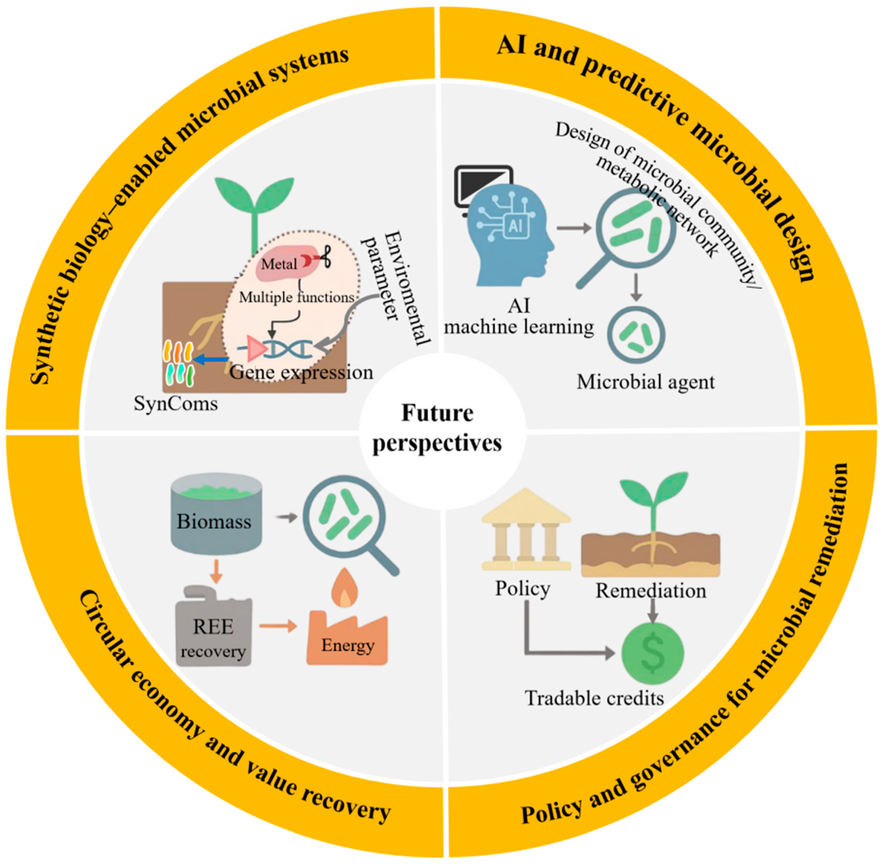 - Emerging frontiers, including synthetic biology-engineered microbes, AI-driven microbial design, resource-recovery circular economies, and supportive policy-governance innovations, are expected to shape a future microbial remediation platform characterized by predictability, controllability, and sustainability. Achieving high-efficiency, reliable, and scalable heavy-metal soil remediation will require coordinated advances in microbial functional enhancement, system integration, risk assessment, and standardization.