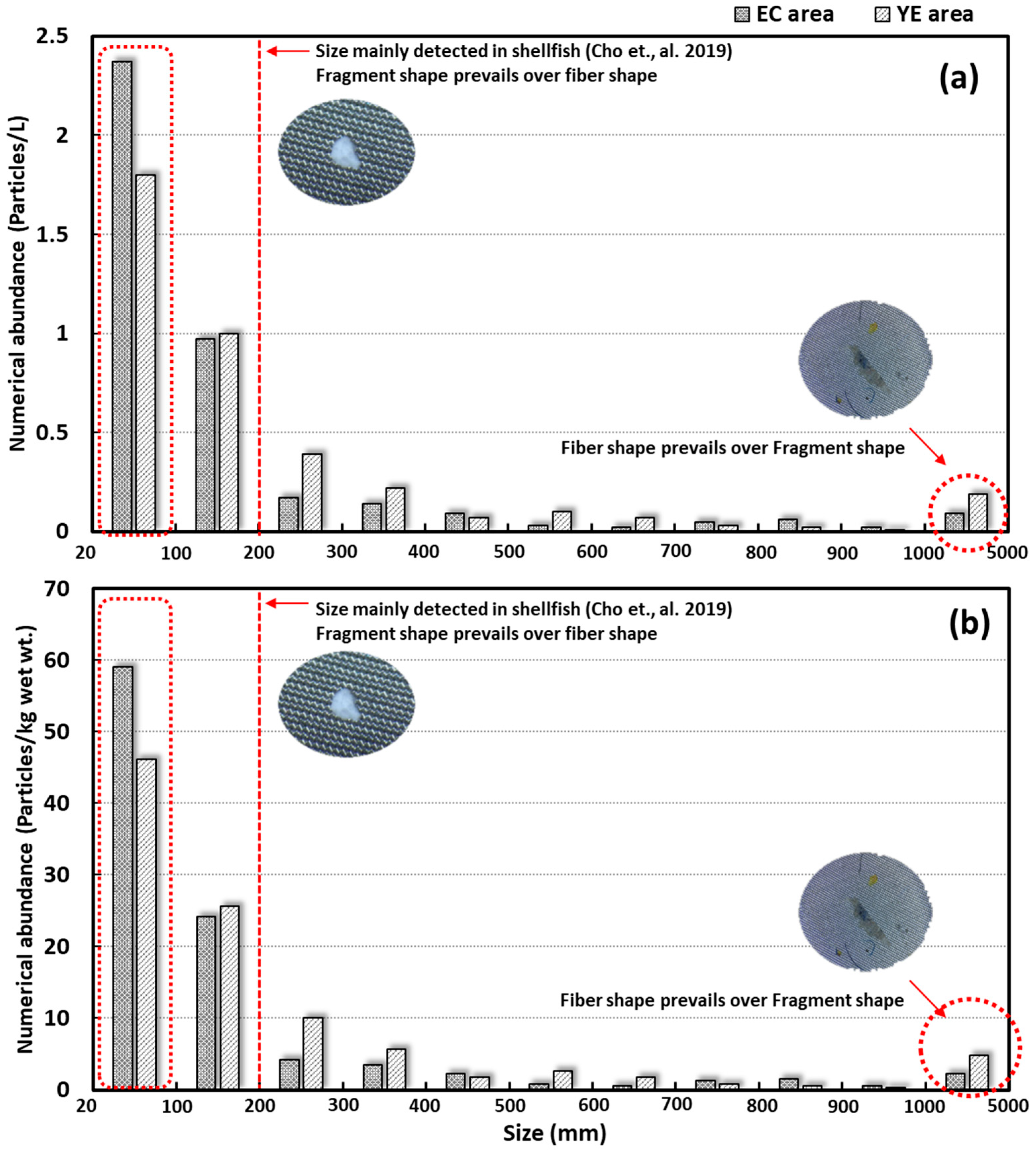 | Size [unit: seawater-%(particles/L)/sediment-%(particles/kg ww)] | ||||