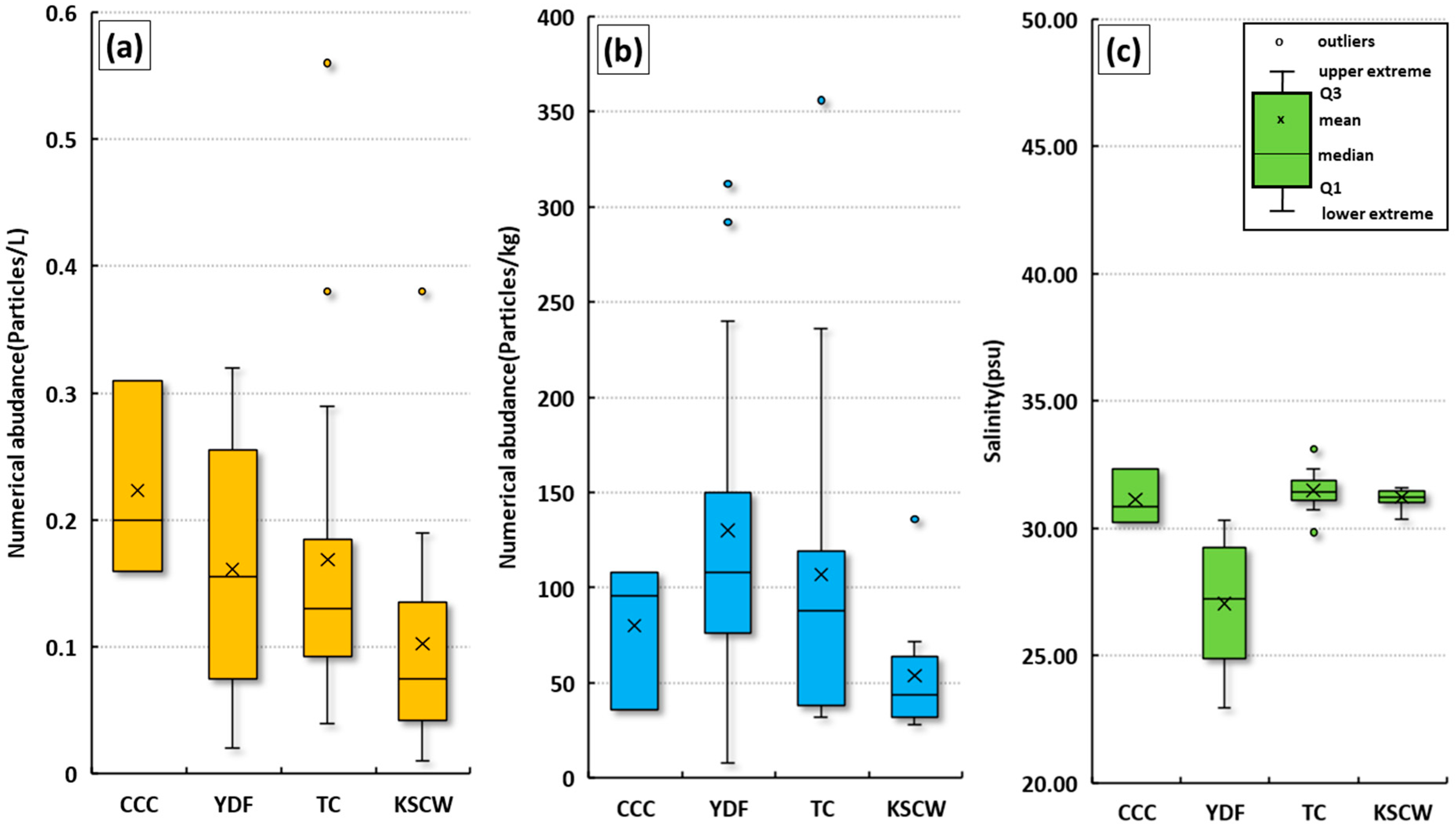 | Abundance [unit: seawater-particles/L/sediment-particles/kg ww] | ||||