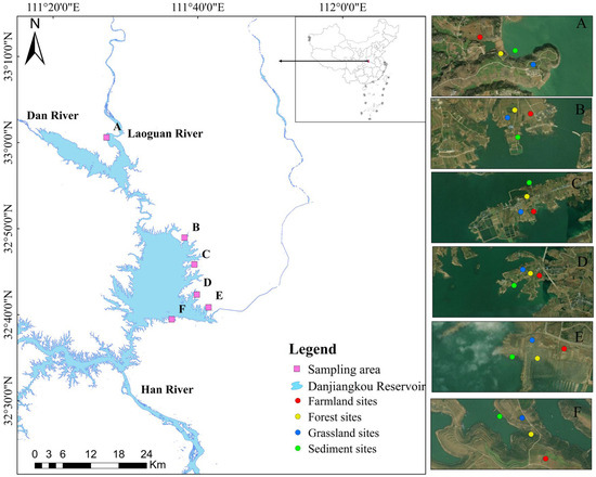 Five sampling areas were selected within the DZ of Dan Reservoir, and one additional area was chosen along the Laoguan River, based on remote sensing image analysis and field investigations (Figure 1). Each sampling area includes farmland, forest land, grassland, and flooded area to ensure the collection of soil samples representing all four land-use types within every sampling location. Sampling was conducted in May, 2024, during the typical dry season, when water levels were lower than 160 m (Figure S1). To reduce the interference caused by small-scale heterogeneity and make the collected samples more representative. At each sampling site, surface soil sub-samples (0–20 cm) were collected using the five-point sampling method and mix in equal amounts to form a representative plot sample [12]. Sediments in flooded areas were obtained using a grab sampler to collect three parallel samples within a 10 m range parallel to the shoreline at each site, which were then mixed [31]. In total, 24 mixed samples were collected. After on-site removal of gravel and plant residues, the samples were placed in self-sealing bags, labeled according to the sampling area and land-use type, and then freeze-dried in the laboratory. Subsequently, the samples were ground and sieved through a 2 mm nylon mesh in preparation for the determination of ten HMs species.