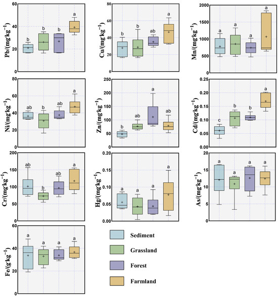 Box and whisker plots of HMs concentrations (mg·kg−1/g·kg−1) in soil from different land uses and sediment adjacent to Danjiangkou reservoir. (In the figure, a, b, and c represent the significance of differences between groups. Different letters indicate significant differences (p < 0.05), while the same letter indicates no significant differences).