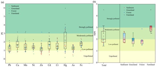 where is the measured concentration of HMs i (mg·kg−1) and is the background value of HMs i in the surface soil of Henan Province (mg·kg−1) [27]. The NIPI integrates the average and maximum PI values across all metals for each sample: