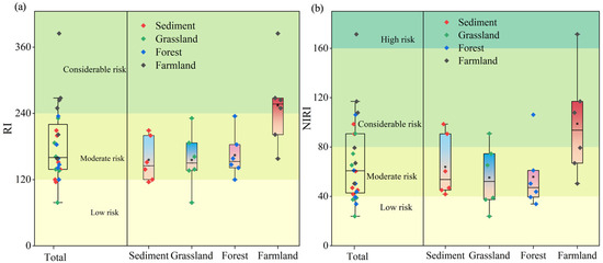 (a): RI indices of HMs in soils from the DZ. (b): NIRI indices of HMs in soils from the DZ.