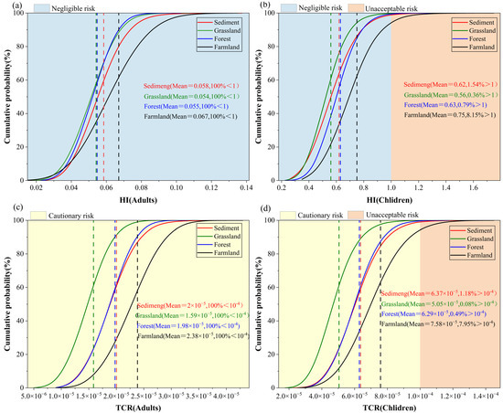 The 2D-MCS results showed that the probability cumulative curves of the total non-carcinogenic risk index for adults did not exceed the USEPA guideline value of 1 (Figure 5a). This suggests that HM exposure through soil contact does not pose potential non-carcinogenic risks for adults in the study area [34]. For children, the overall non-carcinogenic risk remained relatively low. The probabilities of children being posed to unacceptable non-carcinogenic risks were 1.54% in sediments, 0.36% in grassland, 0.79% in forest land, and 8.15% in farmland (Figure 5b). From the perspective of carcinogenic risk, the average TCR of adults in sediments, grasslands, woodlands and farmlands is all below 10−4, but the probability distribution is between 10−6 and 10−4 (Figure 5c). This indicates that, although the possibility of carcinogenic risk among adults in the study area is relatively low, it deserves further attention. Among children, the risk level was increased. In total, 1.2%, 0.1%, 0.5% and 8.0% of the samples in sediment, grassland, forest and farmland, respectively, exceeded the threshold of the unacceptable carcinogenic risk category (Figure 5d).