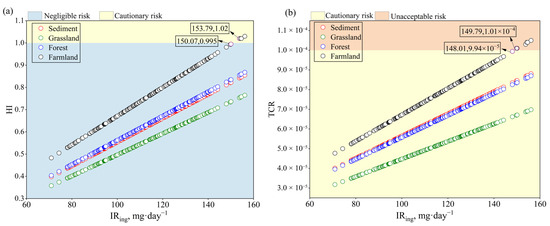 Relationship between children’s soil uptake rate and health risks under different land use types. (a): Total non-carcinogenic risks; (b): Total carcinogenic risks.