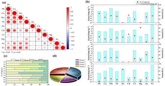 Correlation analysis of HMs in soils from the drawdown area and source apportionment using PMF analysis. (a): Spearman correlation analysis; (b): Factor Profiles; (c): HM factor load; (d): Total factor contribution.