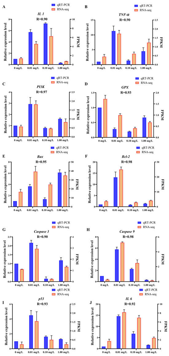 qRT-PCR validation. The X-axis represents concentrations of Dufulin, the left Y-axis represents the relative expression levels of related genes according to qRT-PCR, and the right Y-axis represents FPKM according to RNA-Seq. The qRT-PCR data are expressed as the mean ± SE (n = 3). (A) IL 1, (B) TNF-α, (C) PI3K, (D) GPX, (E) Bax, (F) Bcl-2, (G) Caspase 3, (H) Caspase 9, (I) p53, (J) IL 6.