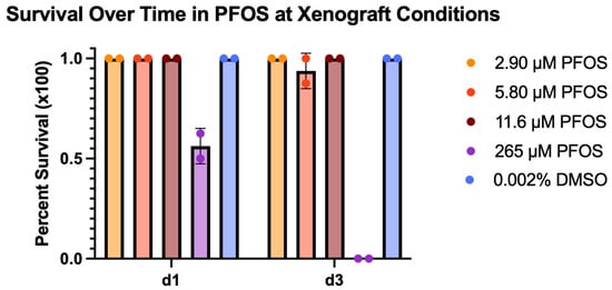 Survival under xenograft conditions from exposure to expected tolerated concentrations of PFOS. A total of 0.002% DMSO was used as a vehicle control, and 265 µM PFOS was used as a positive control. Assessment of survival was performed on 2 dpf embryos raised at 33 °C after 1 day of treatment and 3 days of treatment. Each test group included two biological repeats with n = 8 for each.