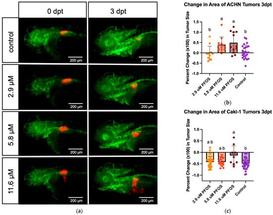 (a) Red fluorescent kidney cancer ACHN cell xenografts overlaid on Tg(kdrl:GCRFP) transgenic embryos with green blood vessels. DiI-labeled cells were injected dorsally to the yolk in the area of the developing kidney of 2 dpf embryos. Images at 0 and 3 days post PFOS treatment (dpt). (b) The percent change in area of ACHN tumors of PFOS-treated xenograft groups after 3 days of chemical treatment. Statistical significance was tested via a one-way ANOVA (α = 0.05) with Fisher’s LSD multiple comparisons test, all pairwise. Different letters above the bars represent significant group differences (p ≤ 0.05) (starting n values—2.9 µM: 16, 5.8 µM: 20, 11.6 µM: 16, Control: 32; final n values—2.9 µM: 12, 5.8 µM: 11, 11.6 µM: 12, Control: 26). (c) The percent change in area of Caki-1-GFP tumors of PFOS-treated xenograft groups after 3 days of chemical treatment. Statistical significance was tested via a Brown–Forsythe ANOVA (α = 0.05) with multiple unpaired Welch’s t-tests, all pairwise. Different letters above the bars represent significant group differences (p ≤ 0.05). (starting n values—2.9 µM: 24, 5.8 µM: 16, 11.6 µM: 16, Control: 32; final n values—2.9 µM: 24, 5.8 µM: 15, 11.6 µM: 9, Control: 31).