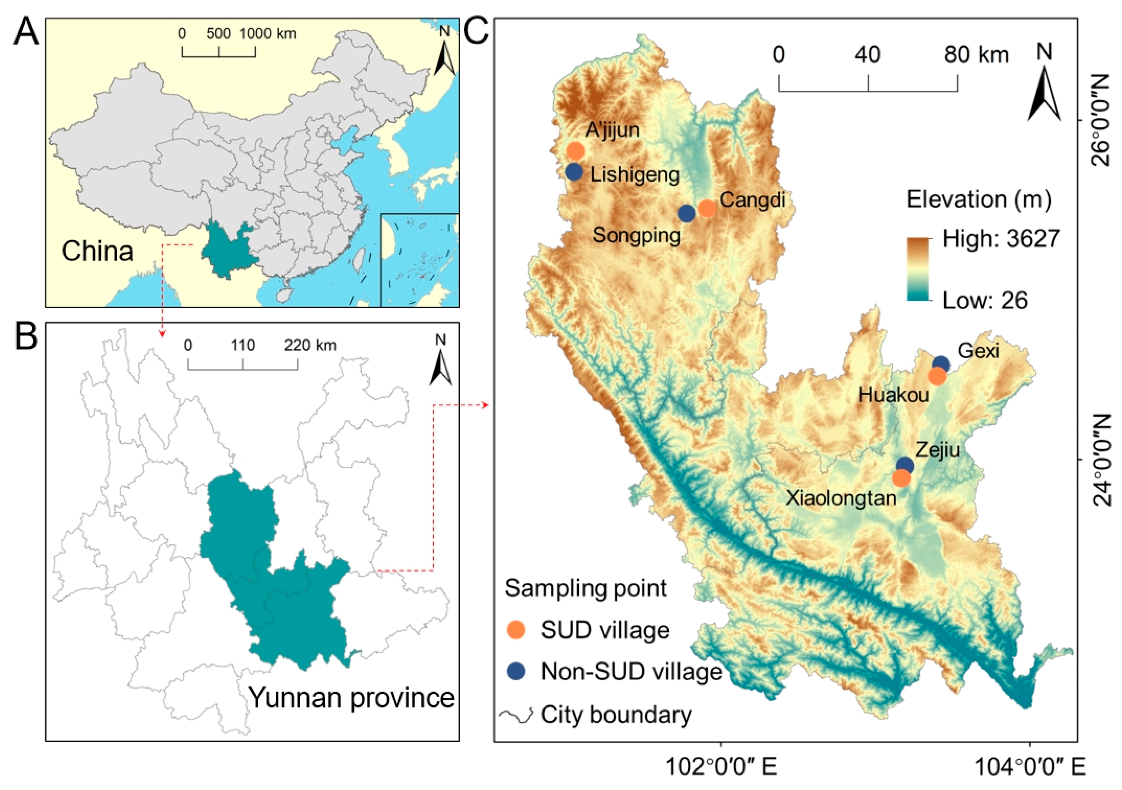 Table 4. The study found that the concentrations of As, Li, V, and Cd in the soil of the four non-SUD villages were all higher than the national background values of soil elements, while the concentrations of Na and Cr were all lower than the national background values [