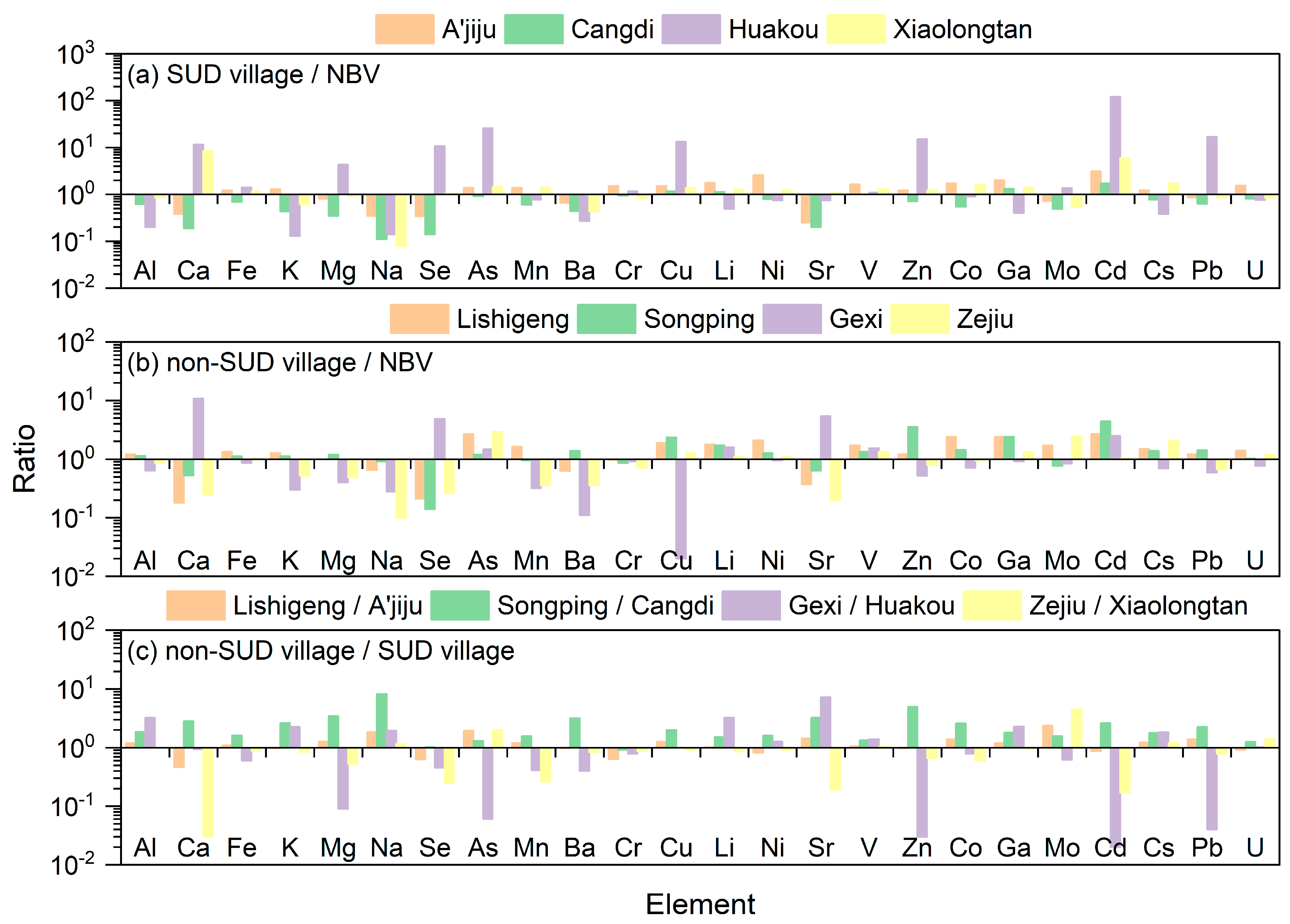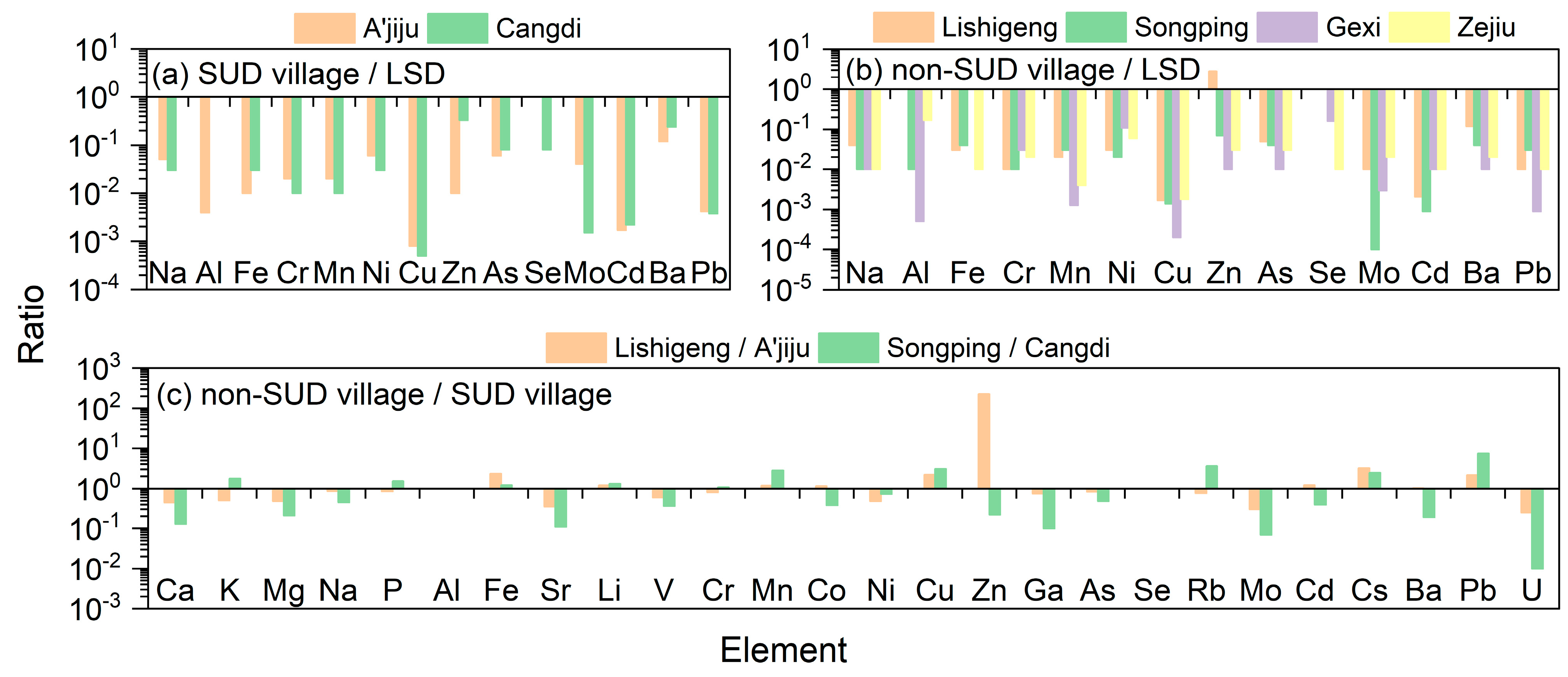 p < 0.05). Among these four non-SUD villages, the concentration differences in Al were the greatest, with the maximum differences reaching 20.22 times, next were Cs (12.97 times) Cd (11.52 times) and Ba (7.41 times), while the concentrations of other elements all had differences below 5 times.