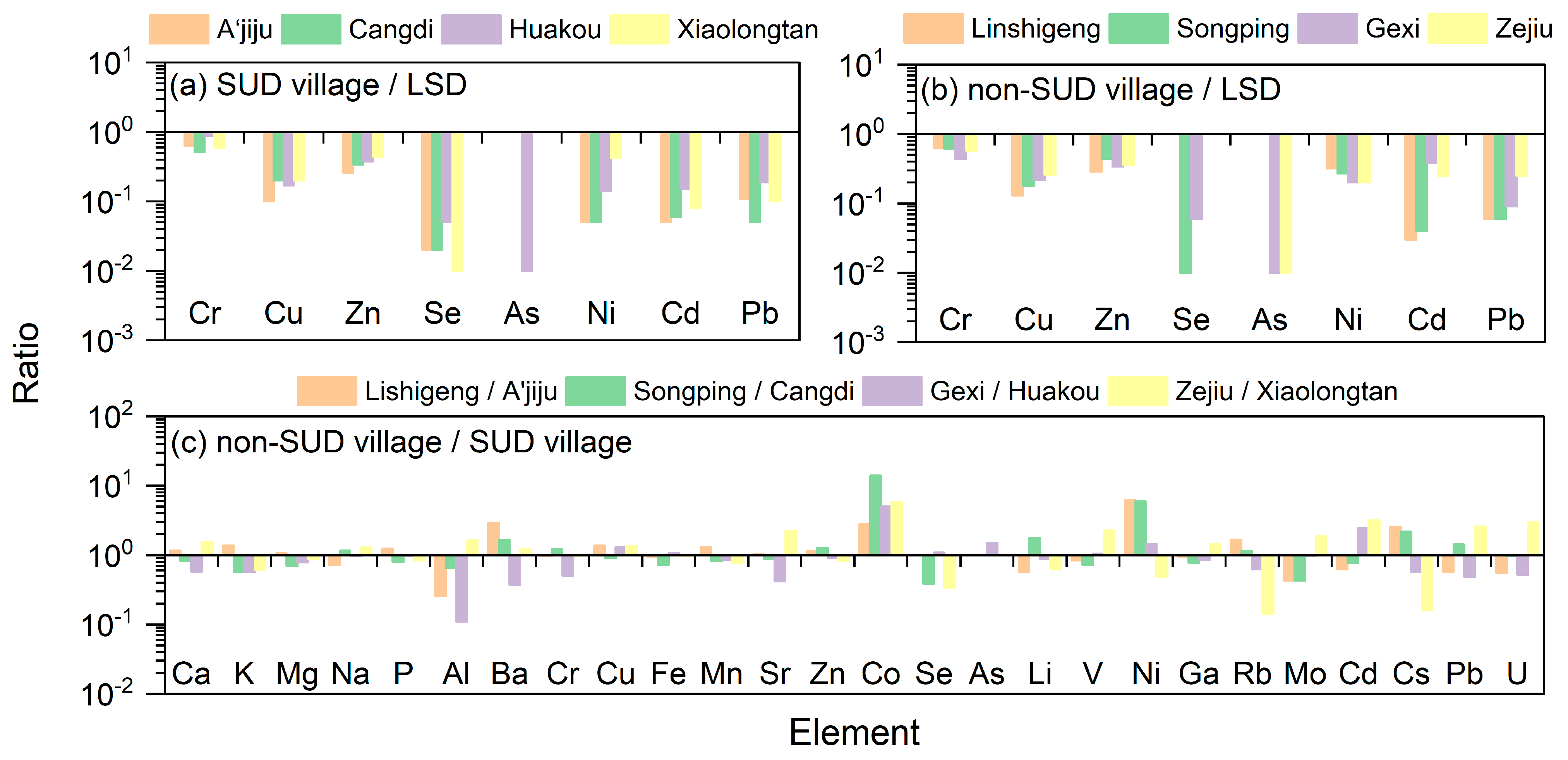 p < 0.05). Among these four SUD villages, the concentration differences of Cs and Rb were the greatest, with the maximum differences reaching 197.19 times and 31.11 times, respectively. Next were Ni (9.04 times) and Li (5.22 times), while the concentrations of other elements all had differences below 5 times.