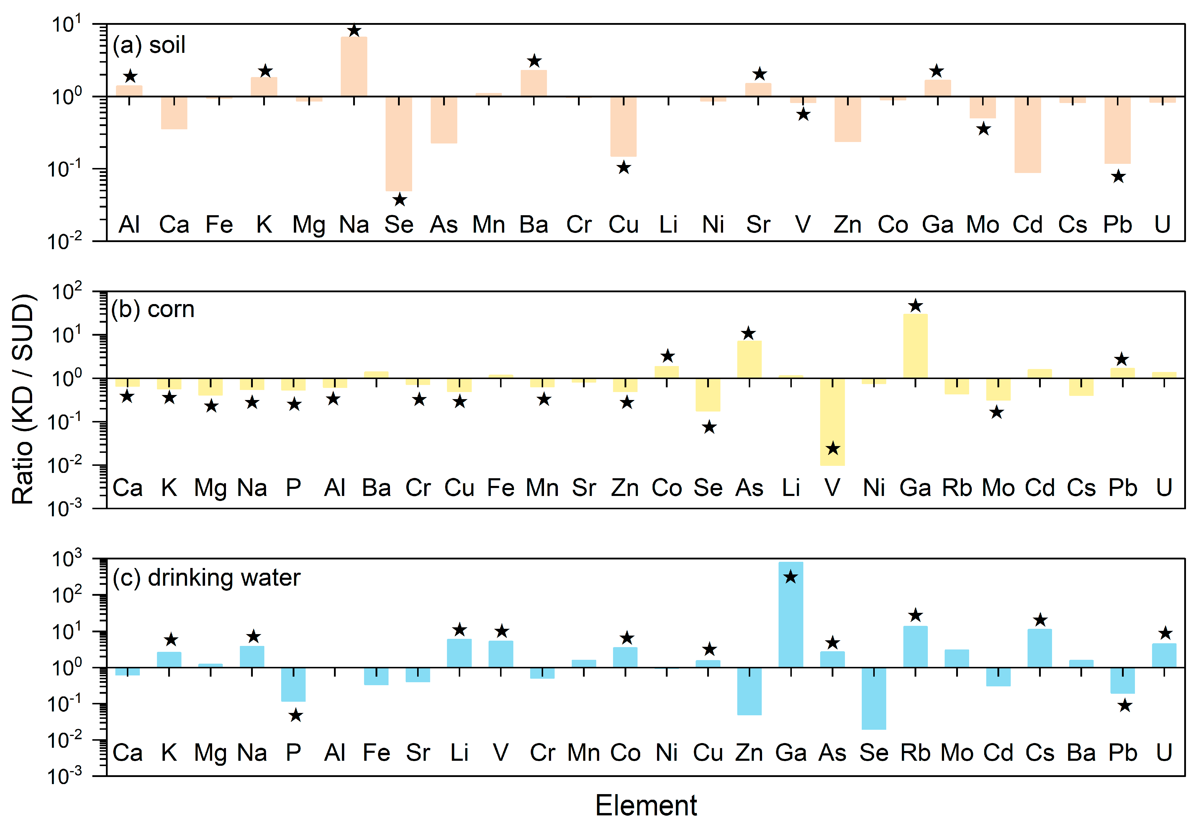 Figure 5b. The average concentrations of Ba, Fe, Co, As, Li, Ga, Cd, Pb and U in the corn of the KD village are greater than those in the SUD village. Among them, the Ga in the corn of the KD village is 29.22 times that of the SUD village, followed by As in the corn of the KD village, which is 7.01 times that of the SUD village, while Ba, Fe, Co, Li, Cd, Pb and U in the corn of the KD village were 1–2 times those of the SUD village. The average concentrations of Ca, K, Mg, Na, P, Al, Cr, Cu, Mn, Sr, Zn, Se, V, Ni, Rb, Mo and Cs in the corn of the SUD villages of Yunnan Province were all higher than those in the KD villages of Shaanxi Province. Among them, the V in the SUD villages in Yunnan Province was 136.89 times that of the KD villages in Shaanxi Province, followed by Se, Mo, Cs, Mg and Rb in the corn of the SUD village, which were 5.61, 3.13, 2.44, 2.37 and 2.21 times higher than those in the KD villages of Shaanxi Province, respectively, while the Ca, K, Na, P, Al, Cr, Cu, Mn, Sr, Zn and Ni in the SUD villages of Yunnan Province were 1–2 times higher than those in the KD villages of Shaanxi Province.