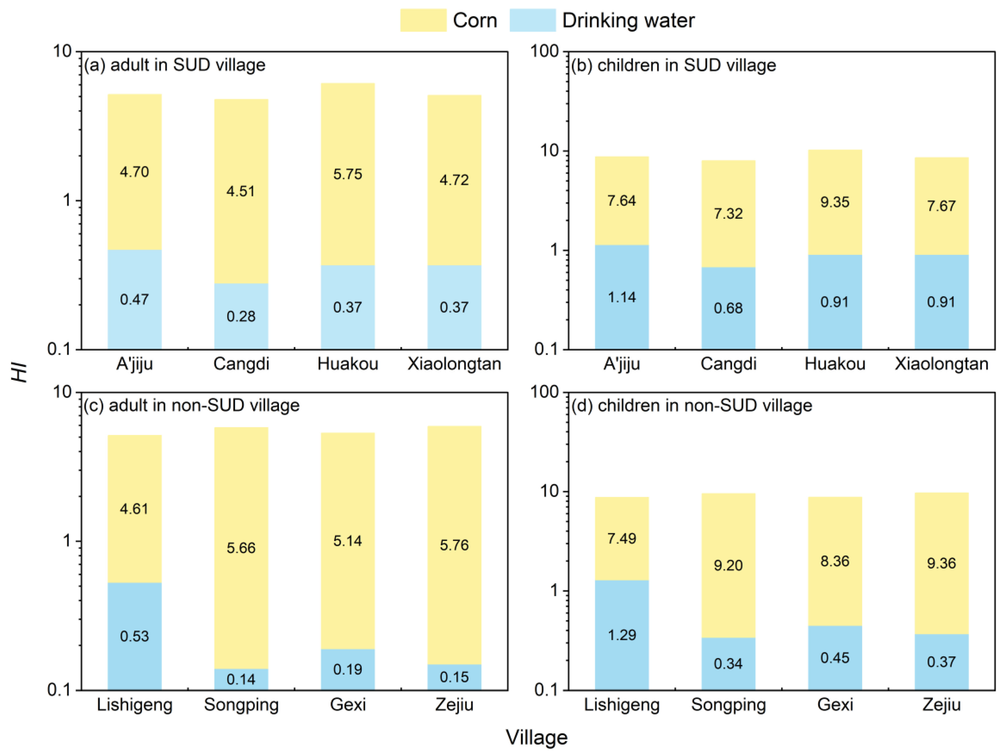 Similarly, the HI results for adults and children in the non-SUD villages of Yunnan Province through the ingestion of corn and drinking water are presented in