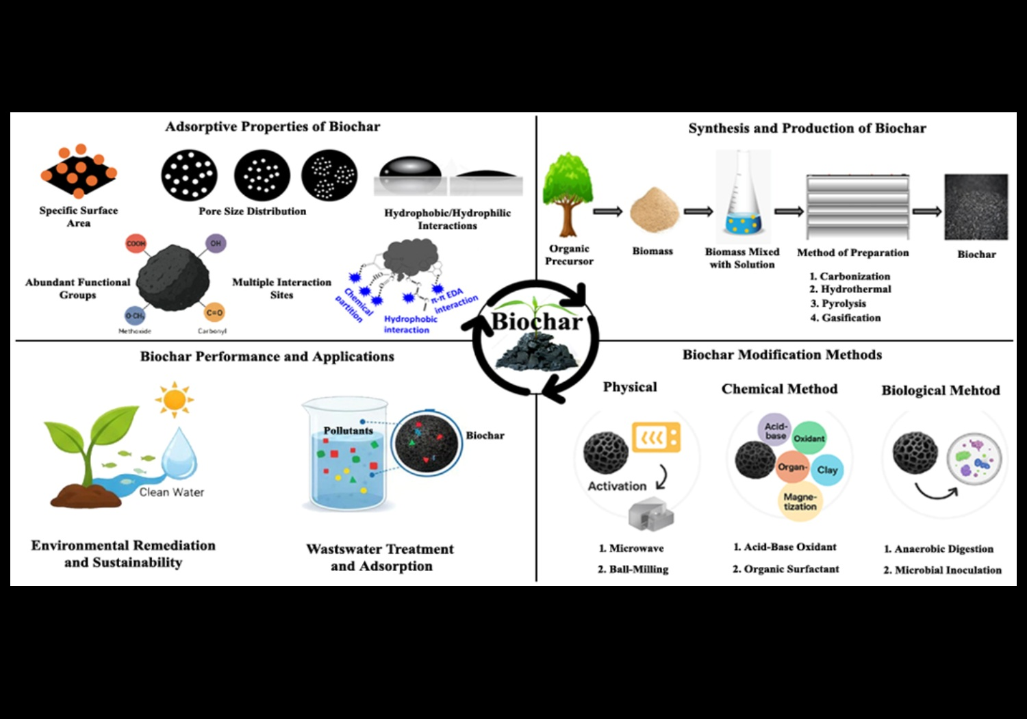 - Diverse applications: The properties of biochar and its production methods, alongside innovative modifications, position it as a multifunctional material that can address both organic and hazardous inorganic pollutants effectively.