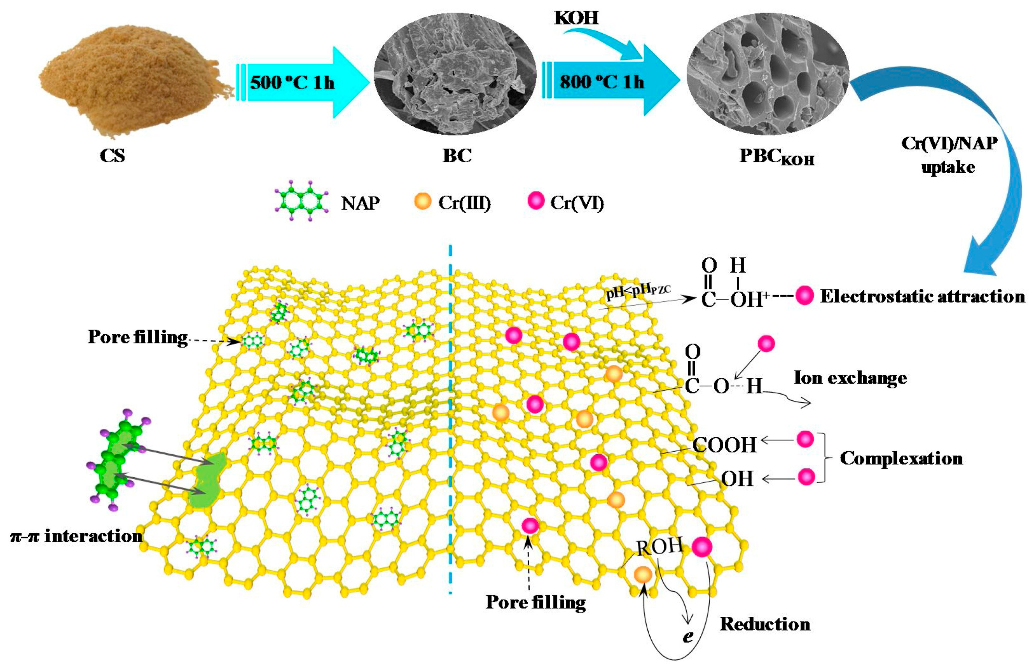 - Qu, J.; Wang, Y.; Tian, X.; Jiang, Z.; Deng, F.; Tao, Y.; Jiang, Q.; Wang, L.; Zhang, Y. KOH-activated porous biochar with high specific surface area for adsorptive removal of chromium(VI) and naphthalene from water: Affecting factors, mechanisms and reusability exploration. J. Hazard. Mater. 2021, 401, 123292. [Google Scholar] [CrossRef]