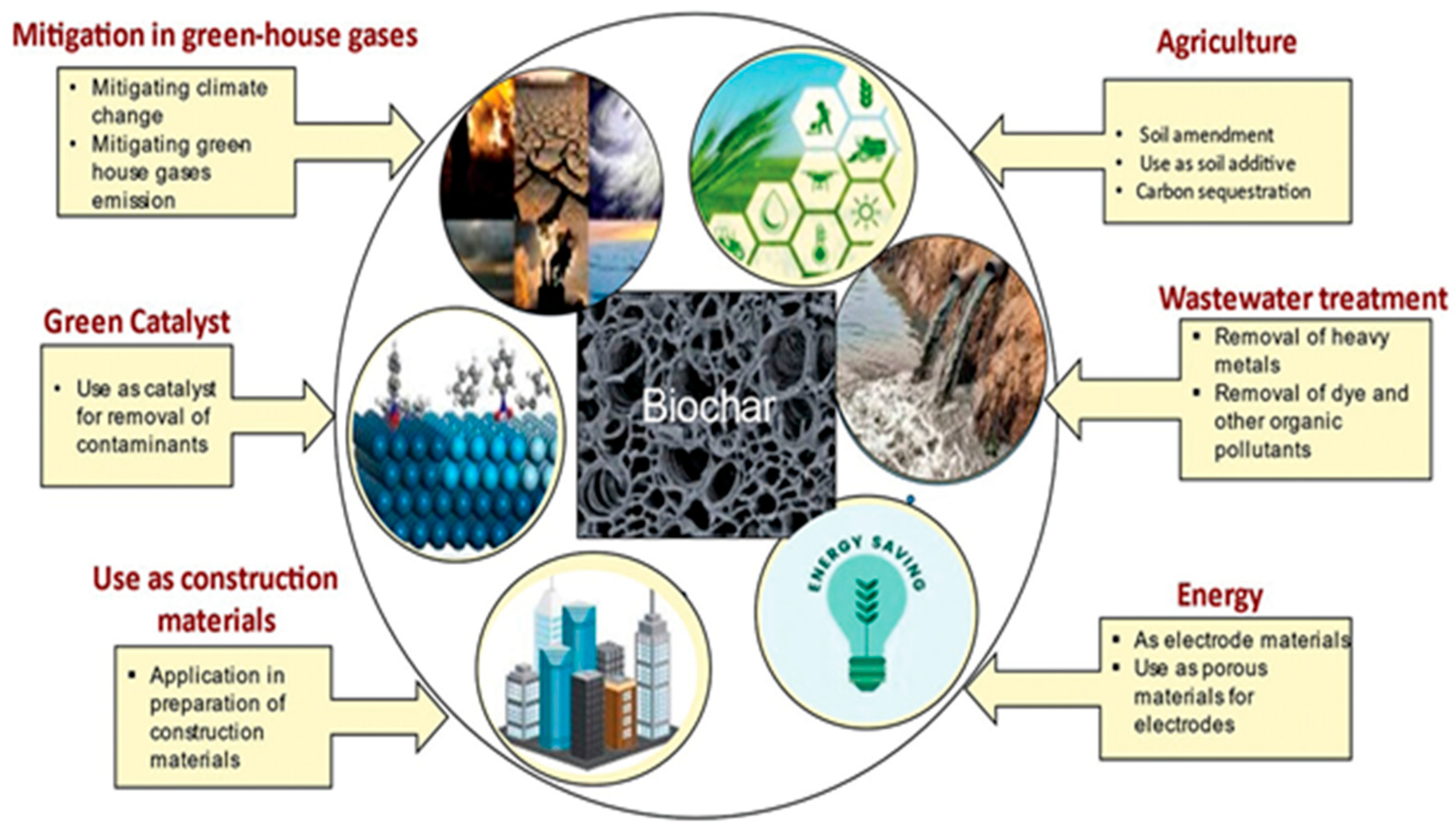 - Beyond its role in wastewater treatment, biochar contributes to climate change mitigation by reducing greenhouse gas (GHG) emissions. Its production from organic waste and subsequent use in soil can sequester carbon, helping to combat climate change while improving soil health.