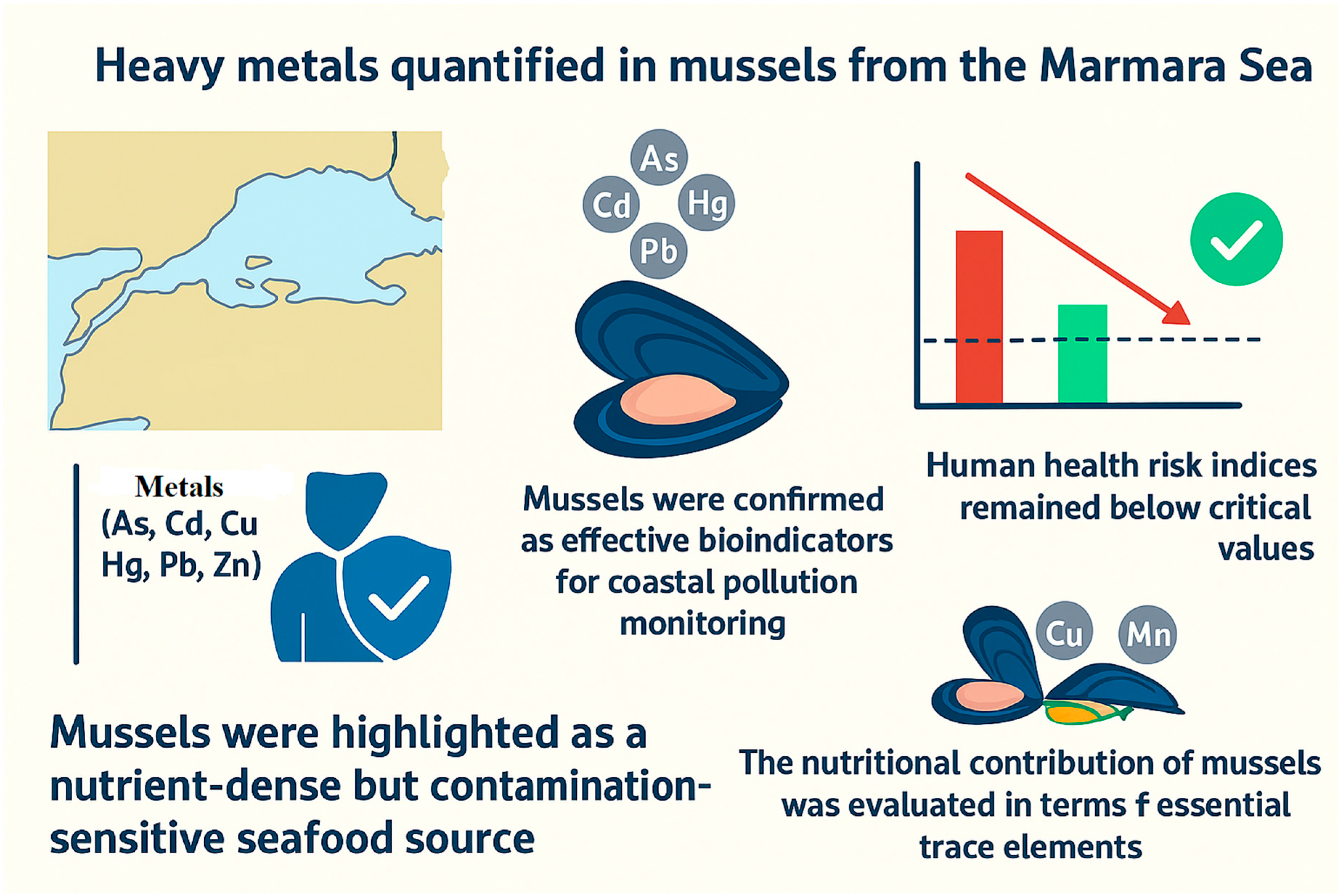 Accordingly, this study aimed to quantify the accumulation of six heavy metals (As, Cd, Cu, Hg, Pb, and Zn) in Mediterranean mussels collected from five coastal sites along the southern Marmara Sea and to assess potential human health risks associated with their consumption. We hypothesized that mussels from areas subject to higher anthropogenic pressure (particularly port zones and densely populated coastal districts) would exhibit elevated metal concentrations compared to less-impacted sites. This study addresses an important regional knowledge gap by integrating spatial bioaccumulation data with human health risk assessment, thereby contributing to ongoing pollution monitoring efforts and supporting public health protection strategies.