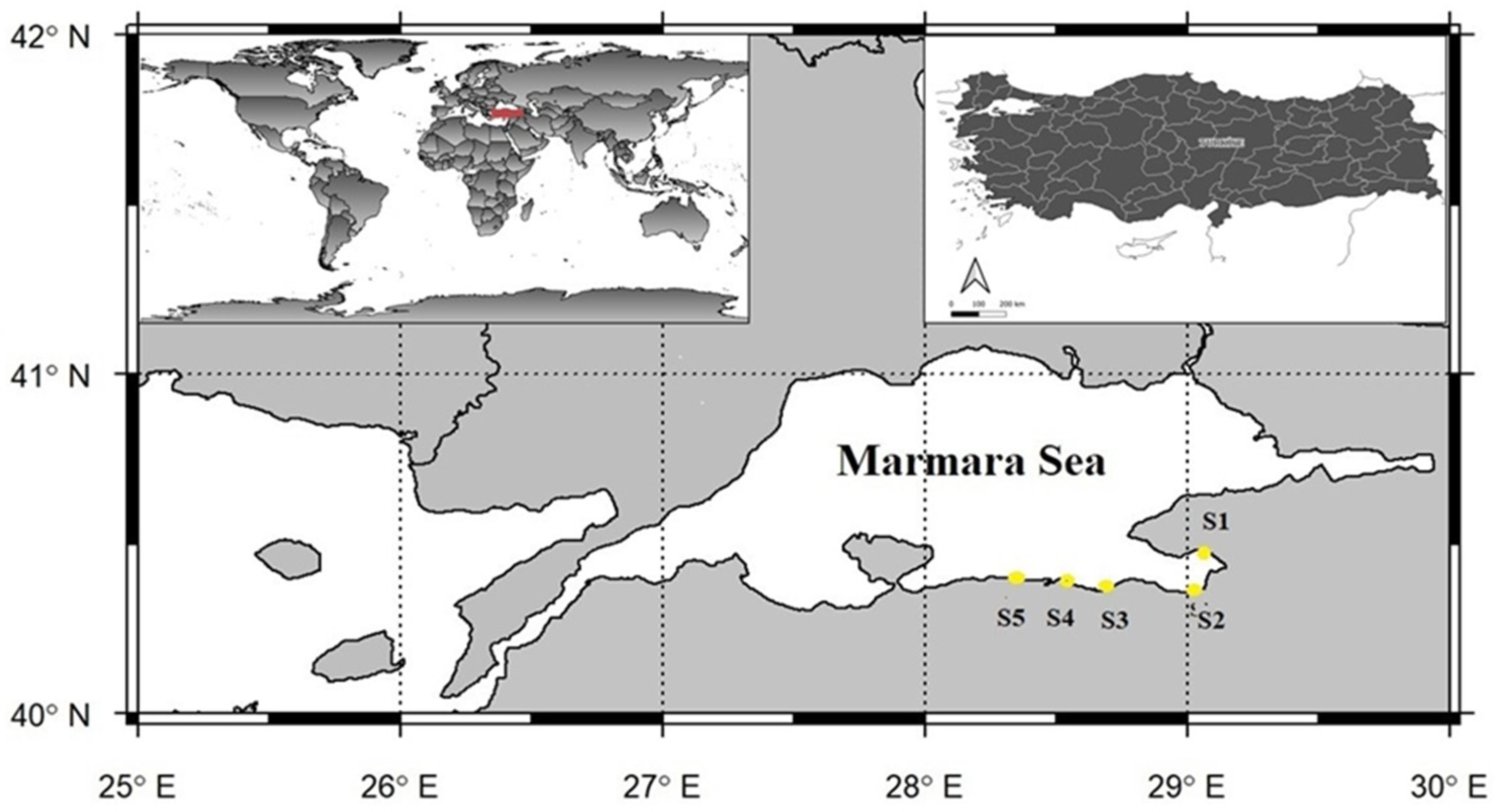 Sampling was limited to five designated stations (S1–S5) located within the southern part of the Sea of Marmara, within the administrative boundaries of Bursa Province (