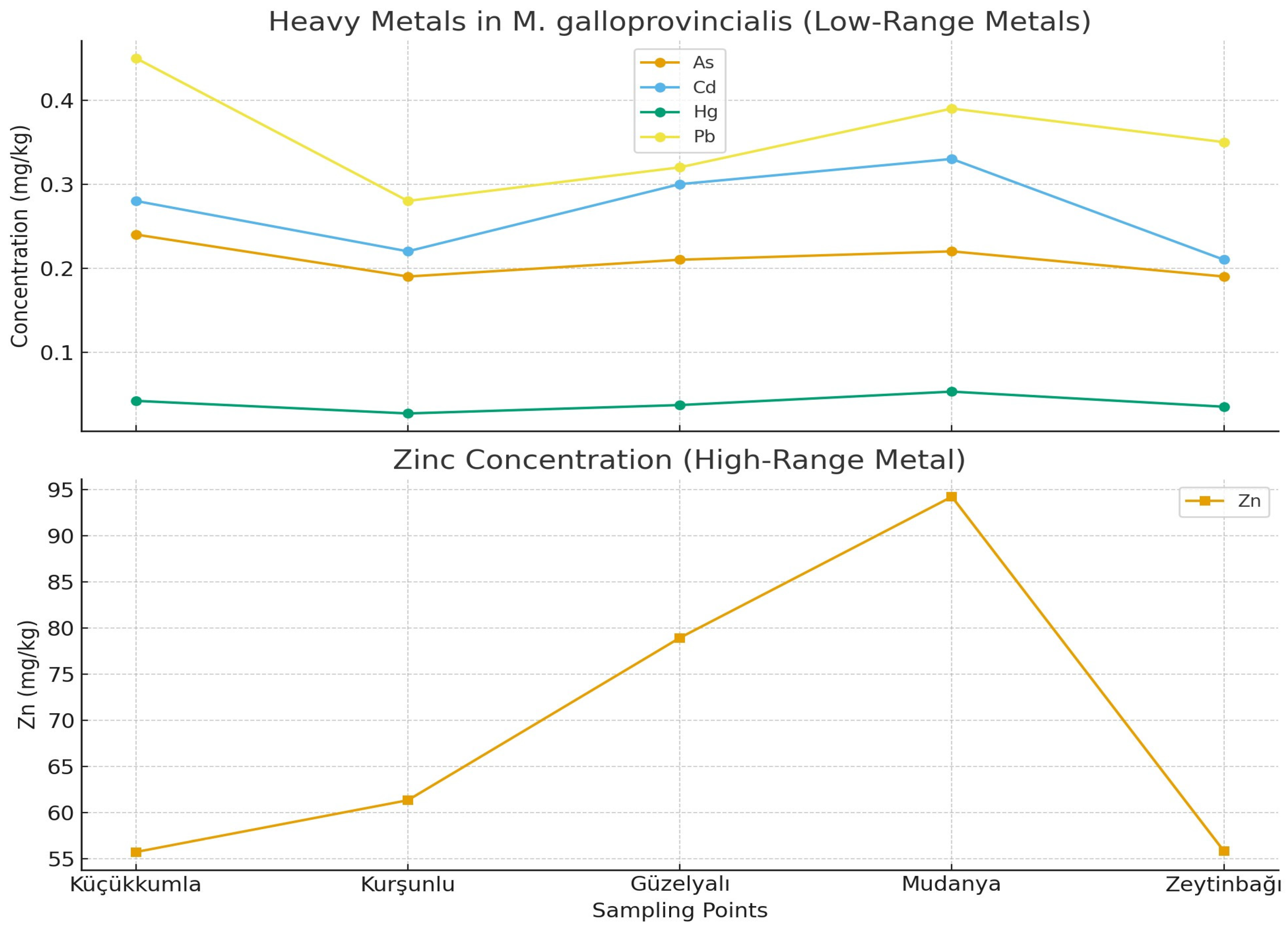Figure 2. Among the analyzed metals, Zn displayed the highest concentrations across all stations, reaching its maximum value in Mudanya (94.25 mg/kg). In contrast, As showed the narrowest range (0.19–0.24 mg/kg), indicating relatively uniform distribution among sites. Cu concentrations varied between 1.79 and 3.11 mg/kg, with the highest levels observed in Kurşunlu.