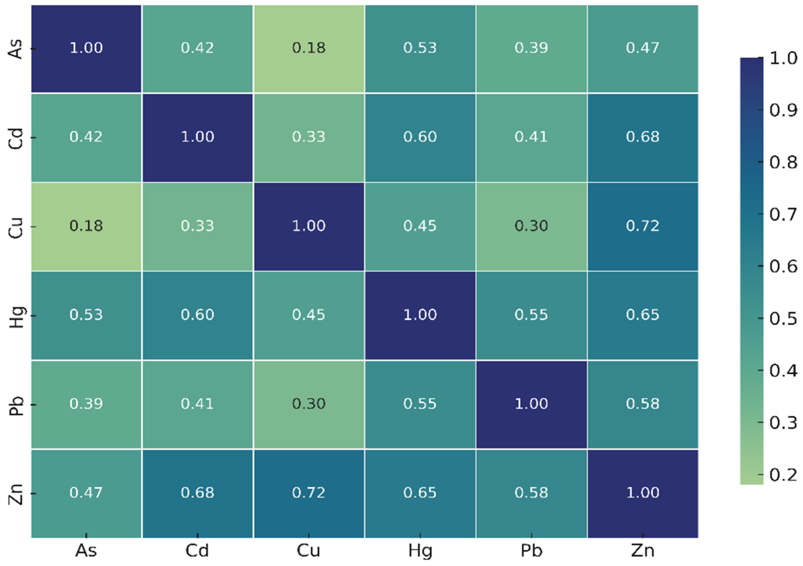 Figure 3) revealed noteworthy positive correlations: Zn–Cu (shared metabolic or uptake pathways), Cd–Zn, and Cd–Hg. These correlations may suggest common accumulation mechanisms or shared environmental sources, although further environmental data (e.g., sediment, water concentrations) would be required to confirm source apportionment.