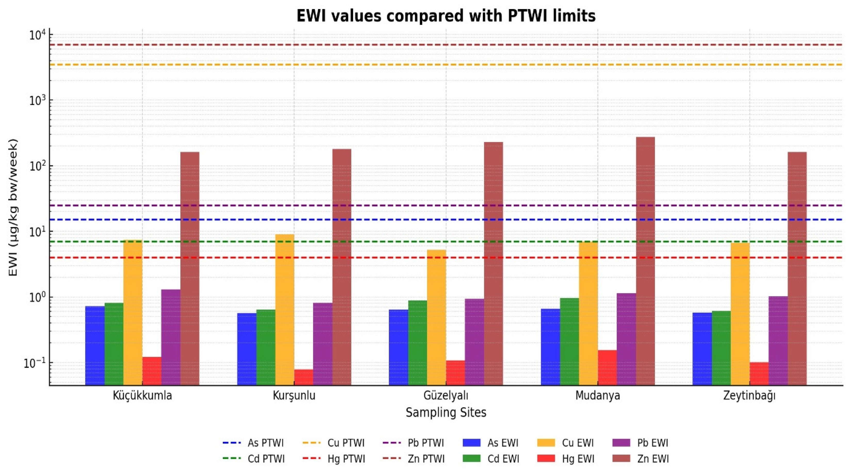 Zinc values exceeded the general food guideline due to the naturally elevated Zn content characteristic of Mediterranean mussels; however, this does not directly imply a toxicological risk without considering actual dietary intake levels. To further evaluate potential health impacts, Estimated Weekly Intake (EWI) values were calculated and compared with Provisional Tolerable Weekly Intake (PTWI) limits (