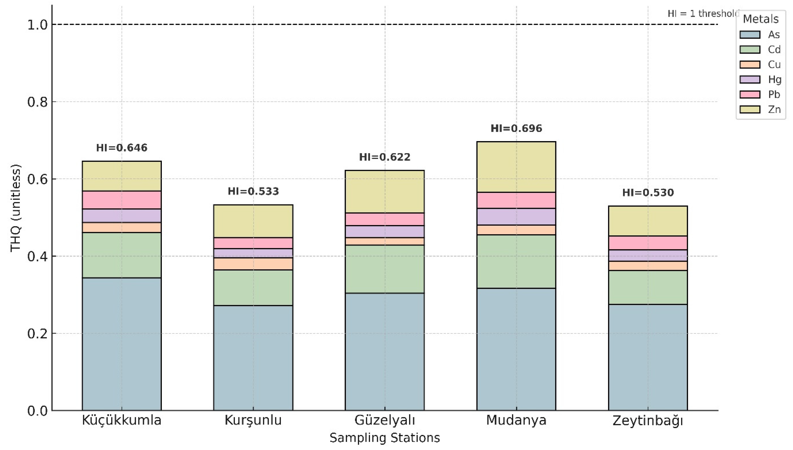 Supplementary Table S2. Across all sampling locations, Adult THQ values for As, Cd, Cu, Hg, Pb, and Zn remained below 1.0, indicating no appreciable non-carcinogenic risk from individual metals. HI values for adults ranged from 0.529 (Zeytinbağı) to 0.695 (Mudanya), with Mudanya exhibiting the highest cumulative risk.