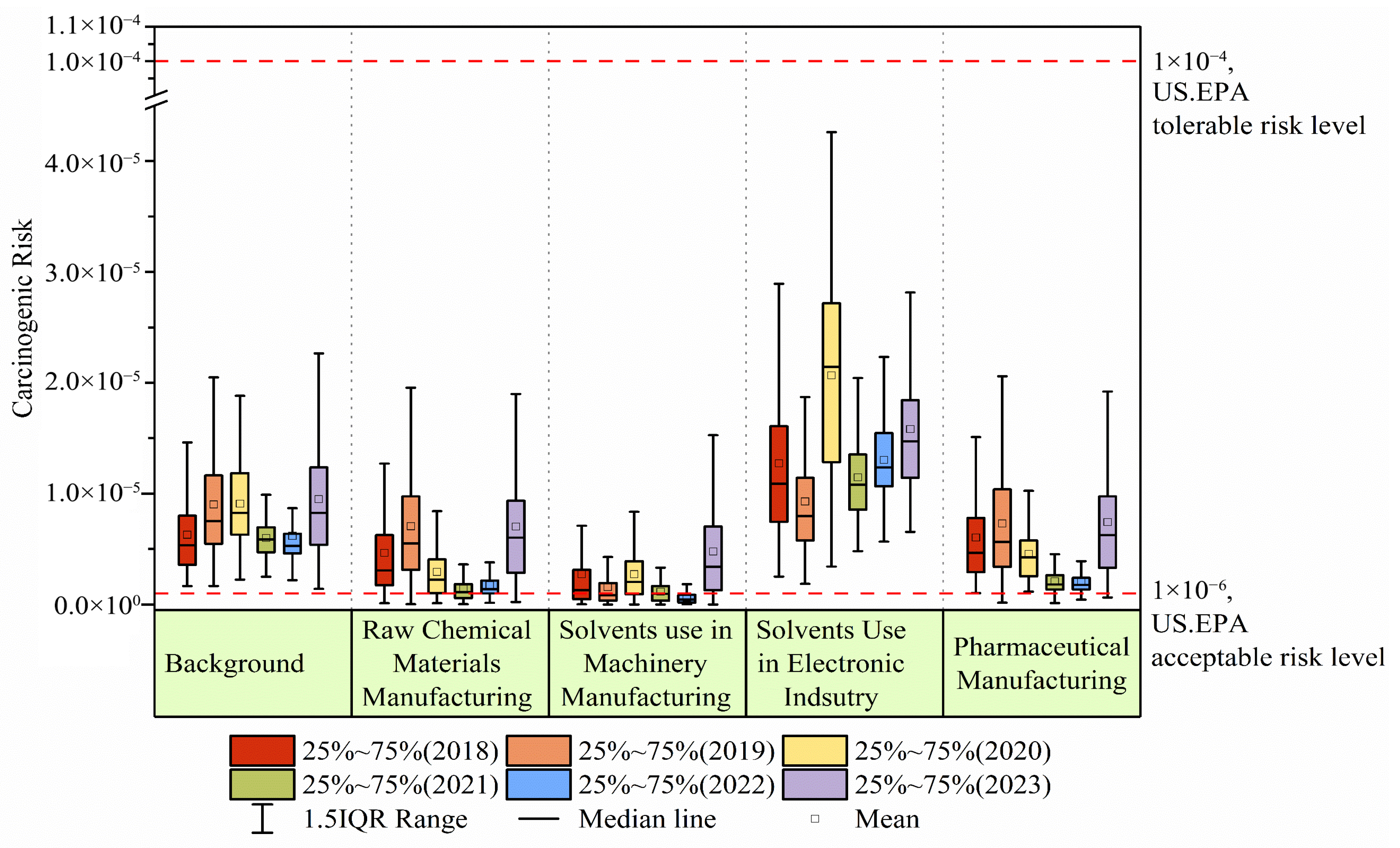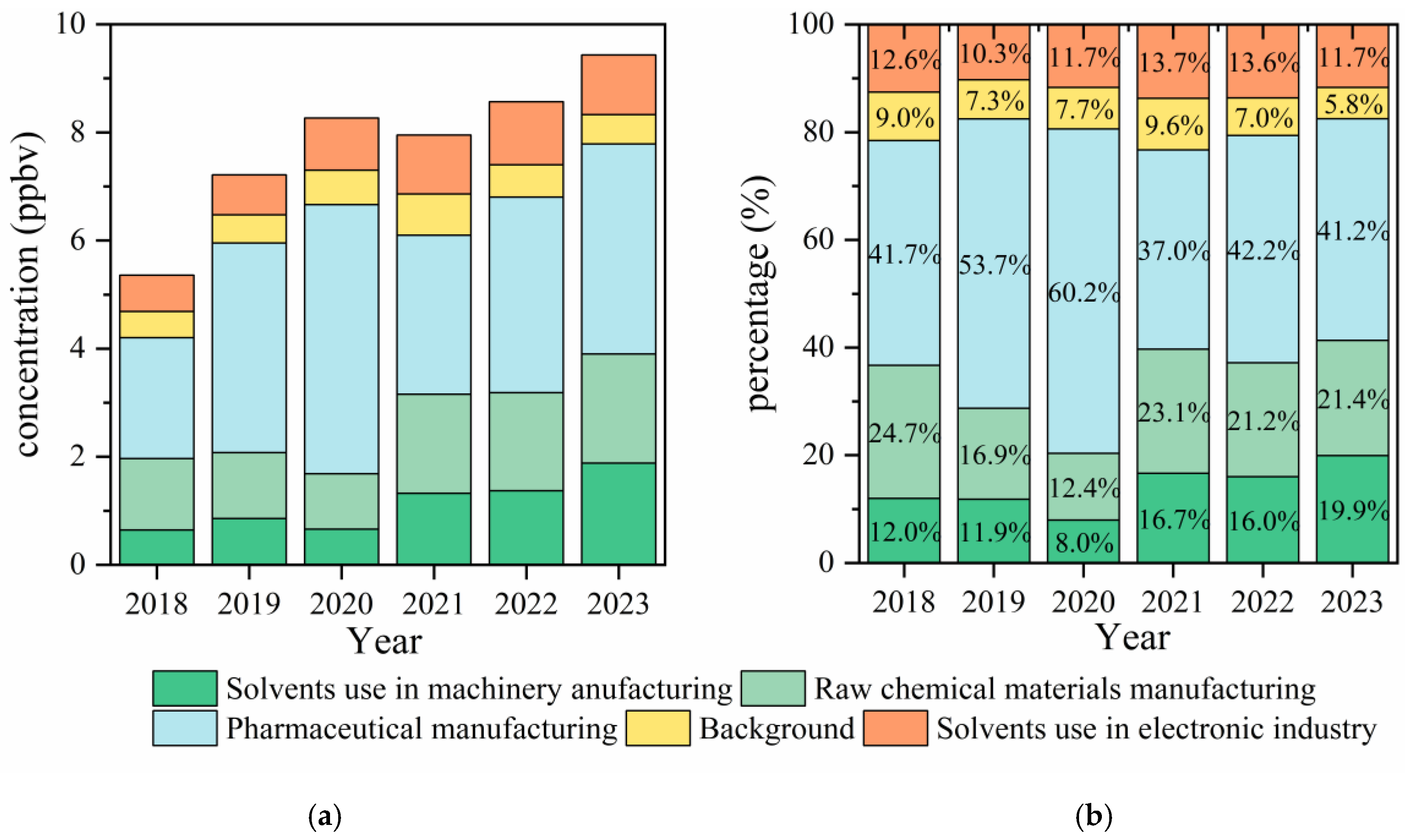 - Zhong, Z.; Ji, Y.; Zhao, M.; Zhou, G.; Hou, Y.; Fan, L.; Ye, D.; Huang, H. Comparison of Emission Characteristics and Risk Assessment of Volatile Organic Compounds of Typical Pharmaceutical Industries in Central Plains, China. Atmos. Pollut. Res. 2025, 16, 102396. [Google Scholar] [CrossRef]