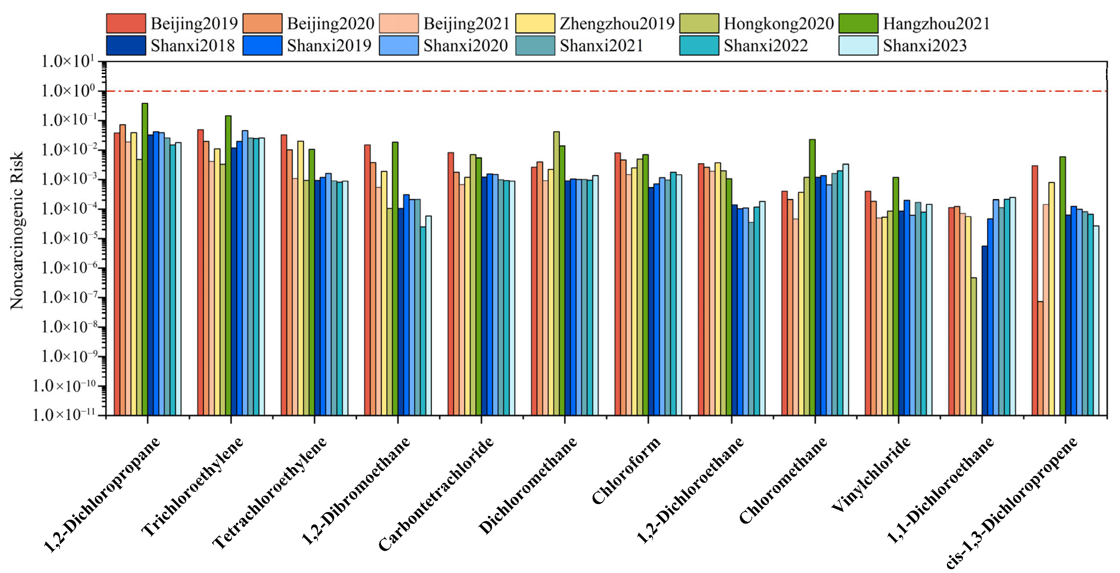 - Ji, Y.; Xu, L.; Li, H.; Wang, C.; Xu, D.; Li, L.; Zhang, H.; Duan, J.; Zhang, Y.; Wang, X.; et al. Pollution Characteristics and Health Risk Assessment of Summertime Atmospheric Volatile Halogenated Hydrocarbons in a Typical Urban Area of Beijing, China. Atmosphere 2020, 11, 1021. [Google Scholar] [CrossRef]