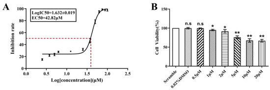 BHPF inhibits the cell viability of endometrial cells. (A) Viability curve at 48 h post-treatment, reflecting the percentage of viable cells across a BHPF gradient. (B) Cell viability of Ishikawa cells after treatment for 48 h was measured by CCK-8 assays. Data are presented as the mean ± SD of at least 3 independent experiments. * p < 0.05, ** p < 0.01. Abbreviation: EC50, median effect concentration; SD, standard deviation; n.s, not significant.
