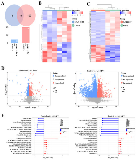 Metabolomics profiles of Ishikawa cells exposed to BHPF. (A) Numbers of up- and downregulated DEMs in different BHPF-treatment groups. (B,C) Heatmap of hierarchical clustering analysis for DEMs between different groups. (D) Volcano plot of BHPF-induced DEMs in the control vs. 0.5 μM and 5 μM groups. (E) Up- and downregulation of the top 20 DEMs. Each group consisted of n = 3, * p < 0.05, ** p < 0.01, *** p < 0.001.