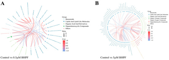 Chord plot analysis of interrelation of DEMs in the two BHPF-treatment groups. (A) Chord plot analysis of interrelation of DEMs between Control and low-exposure group. (B) Chord plot analysis of interrelation of DEMs between Control and high-exposure group.