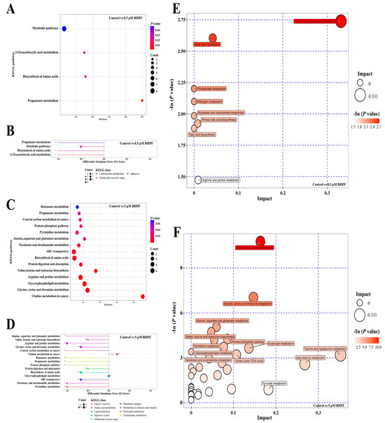 Enrichment analysis of DEMs. (A,C) KEGG enrichment based on the rich factor for DEMs in the control vs. 0.5 μM and 5 μM BHPF exposure groups. (B,D) Differential abundance score for DEMs. (E,F) Pathway analysis for DEMs in different groups. * p < 0.05, ** p < 0.01, *** p < 0.001.
