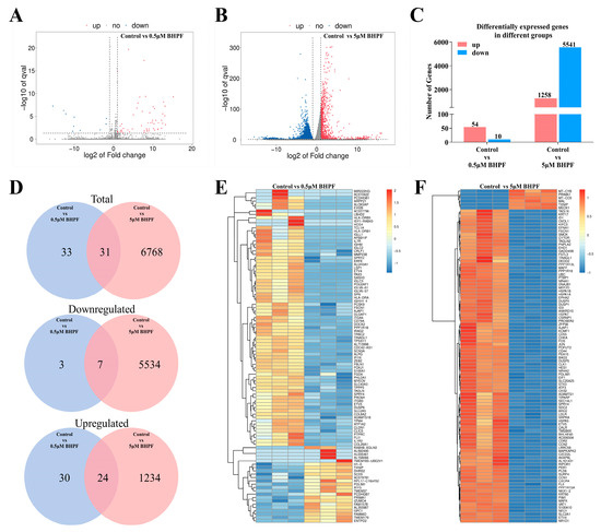 Transcriptomic analysis in Ishikawa cells after BHPF exposure. (A) Volcano plot illustrating the DEGs identified in the transcriptomes of the control vs. 0.5 μM BHPF exposure group. (B) Volcano plot of DEGs of the control vs. 5 μM BHPF exposure group. (C) Number of upregulated and downregulated DEGs in different comparison groups. (D) Venn diagram showing the significantly DEGs in each pairwise comparison and the overlap among them. (E,F) Heatmap of DEGs between the different comparison groups. Each group consisted of n = 3.