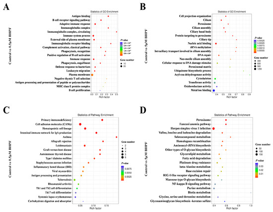 Metabolomics revealed 28 DEMs after exposure to 0.5 μM BHPF, whereas the number of DEMs increased significantly to 128 after exposure to 5 μM BHPF. Pathway analysis revealed that four pathways were significantly affected in the two groups, namely taurine and hypotaurine metabolism, ether lipid metabolism, arginine and proline metabolism, and primary bile acid biosynthesis. We found that the taurine and hypotaurine metabolism pathways and the primary bile acid biosynthesis pathway exert biological effects through a reduction in taurine levels. As reported, taurine can protect cells from oxidative stress damage and regulate anti-inflammatory responses to maintain the immune homeostasis, and is ubiquitous in the uterus [24,25]. Our data demonstrated a reduction in taurine levels in both the low-concentration group (0.5 μM BHPF) and the high-concentration group (5 μM BHPF), suggesting that endometrial epithelial cells may be more susceptible to oxidative damage, leading to an imbalance in the immune inflammatory response and increases in the susceptibility of the immune system to inflammation caused by exposure to BHPF. Moreover, ether lipid metabolism, along with arginine and proline metabolism, has been proven to have significant associations with immune system, tumor growth, and invasion, among other processes [26,27,28,29]. These pathways play essential roles in various biological processes, including signaling transduction, the immune response, cell growth, and so on, highlighting that endometrial epithelial cells trigger immunological reactions persistently, activate important signaling pathways, and ultimately impact cell viability when cells are exposed to BHPF at low to high concentrations. Furthermore, the 5 μM BHPF exposure group presented unique regulated pathways, primarily associated with energy metabolism and amino acid metabolism. We mainly found that pyruvic acid decreased significantly by approximately 3.6 times in the 5 μM BHPF exposure group and that beta-alanine decreased by more than 6.7 times. Pyruvic acid is well known to participate in pyruvate metabolism, butanoate metabolism, the citrate cycle, alanine, aspartate, and glutamate metabolism. Reduction of pyruvic acid impairs the synthesis of ATP, amino acids, lipids, and proteins; and influence cellular processes, resulting in the disruption of the cell proliferation, differentiation, and survival of endometrial cells [30,31,32]. In addition, beta-alanine is a crucial nonessential amino acid that participates in the synthesis of important coenzymes, such as coenzyme A (CoA), influencing cellular metabolism and energy utilization [33,34]. Additionally, it can neutralize intracellular free radicals, mitigate oxidative stress-induced cellular damage, and maintain cellular homeostasis [35]. Thus, the high-concentration exposure of BHPF to endometrial epithelial cells results in a decreased level of beta-alanine, thereby leading to disrupted cellular energy metabolism and ultimately causing severe adverse effects on cellular function. To explore the underlying molecular mechanism by which BHPF exerts adverse effects on endometrial epithelial cells, a transcriptome analysis was performed. Transcriptomic analysis revealed that primary immunodeficiency was the main enriched biological process after low-concentration exposure to BHPF. With increasing exposure concentration, multiple signaling pathways related to metabolism, the immune response, DNA damage, and oxidation–reduction process, such as the RLR signaling pathway and the NF-κB signaling pathway, were affected, which is consistent with the metabolomics analysis results.