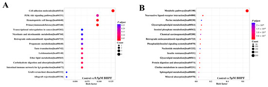 Joint analyses of differential transcripts and metabolites. (A) Bubble plot of joint KEGG enrichment analysis between the DEMs and DEGs in the control vs. 0.5 μM BHPF exposure group. (B) Bubble plot joint KEGG enrichment analysis between the DEMs and DEGs in the control vs. 5 μM BHPF exposure group.
