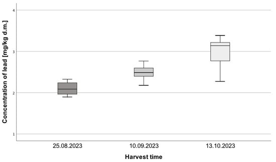 The obtained results are confirmed by statistically significant differences in Pb concentration among the different time periods, H = 29.45; p < 0.001; η2 = 0.67 (Figure 1). Pairwise comparisons using Dunn’s post-hoc test revealed that each harvest period differs significantly from the others in terms of the concentration of this element. In the last harvest period, the concentration of this element was higher compared to the beginning of the collection (p < 0.001) and the second period (p = 0.003). The same applies to the comparison of the second period to the first (p = 0.005). The effect size of 0.64 indicates a significant impact of the passage of time on the Pb concentration in the collected Amanita muscaria samples.
