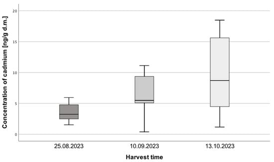 Statistically significant differences were also observed in Cd concentrations, H = 6.99; p = 0.03; η2 = 0.13 (Figure 2). The Cd concentration in the last harvest period of Amanita muscaria was higher compared to the first period (p = 0.03). The effect size of 0.13 indicates a moderate effect of the passage of time on the Cd concentration in the collected Amanita muscaria samples.