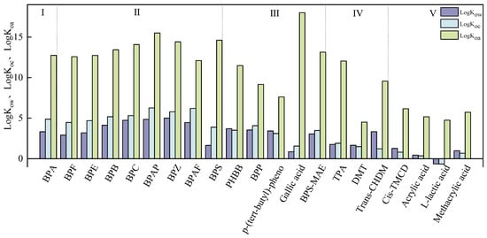 EPI simulation of each BP distribution coefficient (I: BPA; II: BPA analogues; III: BPA replacement compounds with one phenol; IV: BPA replacement compounds with aromatic rings; V: acyclic compounds). EPI SuiteTM provided by the EPA was used to calculate several parameters of BPA and its substitutes. The log octanol-water partition coefficient, log Kow, of chemicals is estimated using an atom/fragment contribution method; the Henry’s Law constant (air/water partition coefficient) is calculated using both the group contribution and the bond contribution methods; and Koc is estimated using two different models: the Sabljic molecular connectivity method with improved correction factors and the traditional method based on log Kow. After EPI software calculates logKow, logKoa, and logKoc parameters of each substance, origin software is used to plot the data.