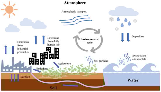 Schematic diagram of BP propagation in various media [32,35,36,37,38]. Industrial production, daily life, and agricultural production release BPs to the atmosphere, soil, and surface water. The BPs in the atmosphere diffuse through long-distance atmospheric transport and return to the soil and water through dry and wet settlement, the BPs in the soil surface penetrate into the groundwater and the groundwater flows into the surface water, and the BPs in surface water enter the atmosphere and soil through evaporation and contact so as to achieve environmental circulation.