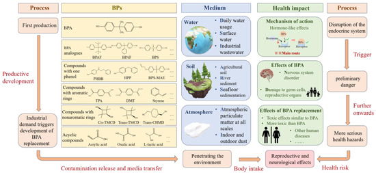 BP production, distribution, and harm to human health. The limited use of BPA has led to the emergence of BPA substitutes; BPA and its substitutes penetrate into the water, soil, and atmospheric environment; and humans are further exposed to BPs in the environment, causing adverse health effects, such as nervous, reproductive, and immune effects.