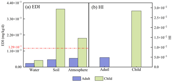 As shown in Figure 5, the EDI exposure level shows the phenomenon of water < atmosphere < soil. BPs are not easily soluble in water, and their exposure level in water is relatively low. The EDI value of soil is higher than the average exposure level of the whole environment (1.29 × 10−3), followed by the atmosphere, suggesting that more attention needs to be paid to BPA pollution in soil and the atmosphere. The average value of the overall environment needs to be lower than the present calculated average, as the EDI value in the water environment is overestimated in the calculation (1.29 × 10−3). The EDI is consistently higher in children than in adults, which may be attributed to the comparatively low body weight of children. Further, HI < 1, suggesting that the current BPA level poses no carcinogenic risk to children or adults and can be disregarded. Children are at a higher health risk than adults, as evidenced by their health risk being six times greater than that of adults (HI children (0.03) > HI adults (0.005)). This may be attributed to the immaturity of children’s bodies and their compromised metabolisms, which can increase their susceptibility to pollutants [83,84]. After analyzing the data, it is evident that the current levels of environmental exposure and associated health risks are not alarmingly high; however, it is important to understand that children are still susceptible to these health risks.