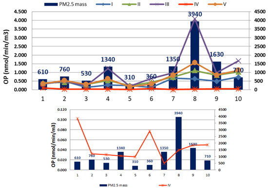 Figure 1 shows that for individual samples, it is clearly seen that higher mass does not necessarily lead to higher OP values and vice versa. Samples with higher PM2.5 mass might show higher OP values. However, this is not always the case, considering the complexity of the chemical components involved in the composition of the particles. The best agreement for the tested protocols was determined between protocols II and V, then for protocols I and V, although slightly higher OP values were determined for protocol V. The reason for the higher values found for protocol V may be due to several factors, which will be explained below.