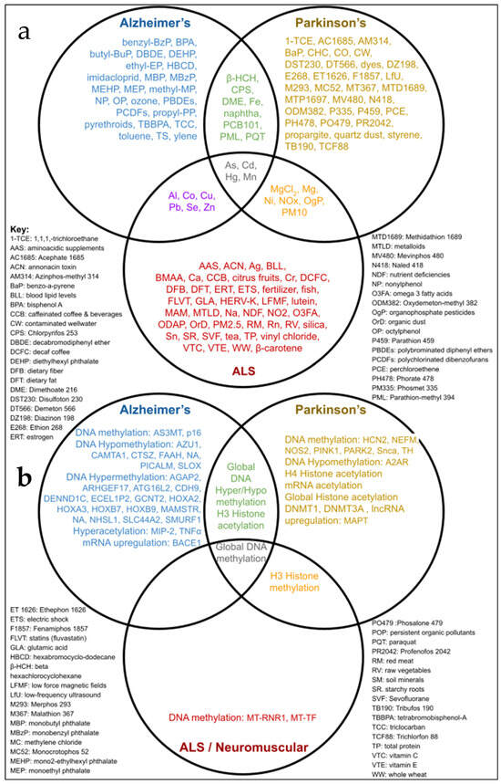 Venn diagram identifying environmental factors and epigenetic changes common to Alzheimer’s Disease, Parkinson’s Disease, and amyotrophic lateral sclerosis (ALS). Venn diagrams show the associations between AD, PD, and ALS with (a) environmental toxins and (b) epigenetic changes. Factors only associated with one neurodegenerative disease are shown in each outside circle (blue, red, or yellow text), whereas toxins shared by only two neurodegenerative diseases are shown in segments within two neurodegenerative disease circles (purple, orange, or green text). Toxins implicated in Alzheimer’s Disease, Parkinson’s Disease, and amyotrophic lateral sclerosis are shown in the central shared segment (gray text).