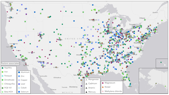 Figure 2 maps the source locations regulated by the EPA for the industrial manufacturing and distribution of toxicants also associated with AD, PD, or ALS [29]. Sources of heavy metals in the U.S. were primarily located in Eastern states, and included primary metal manufacturing, fabricated metal product manufacturing, petrochemical manufacturing, plastics material and resin manufacturing, wood product manufacturing, pharmaceutical and medicine manufacturing, and electrical equipment, appliance, and component manufacturing. Toxin sources tended to be more dispersed and less concentrated in large clusters within Western regions.