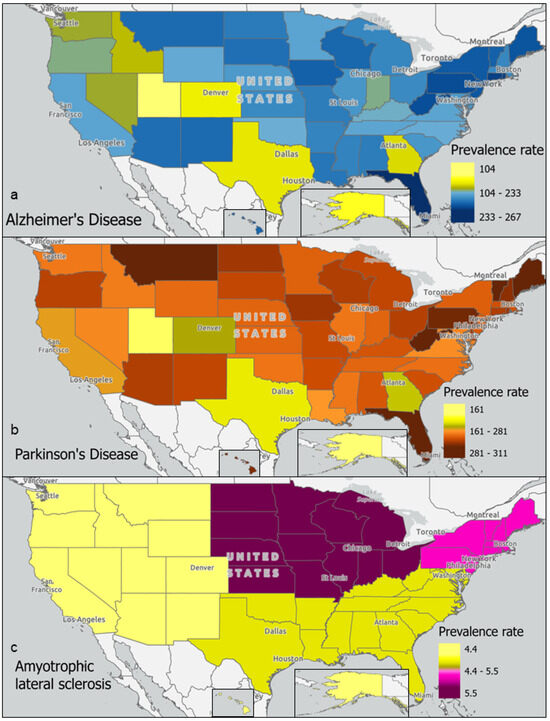 Neurodegenerative disease prevalence rates in the United States. Prevalence rates (per 100,000 persons) of (a) Alzheimer’s Disease, (b), Parkinson’s Disease, and (c) amyotrophic lateral sclerosis are mapped geographically in ArcGIS. Prevalence rates are reported per 100,000 persons.