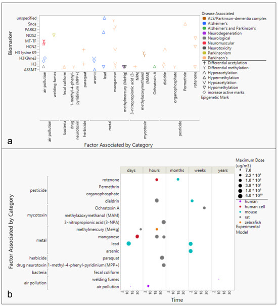 Trends of epigenetic biomarkers associated with exposure to environmental factors by time and dose for Alzheimer’s Disease, Parkinson’s Disease, and amyotrophic lateral sclerosis. (a) Studies of exposure to environmental toxins reported changes in epigenetic biomarker pattern (acetylation or active marker changes) outcomes that are known to be associated with neurodegenerative diseases. (b) Experimental models and human cohort or case–control studies of AD, PD, and ALS reported changes to epigenetic markers based on time and dose response.
