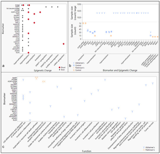 Epigenetic biomarkers by tissue type and associated pathways in Alzheimer’s and Parkinson’s Disease. (a) Biomarkers identified in the literature are grouped by epigenetic changes and tissue type. (b) Subject counts for patient or control specimens are plotted by biomarkers categorized by epigenetic changes associated with disease. (c) Biomarkers are further grouped by primary general or disease-specific function(s) and associated neurodegenerative disease.