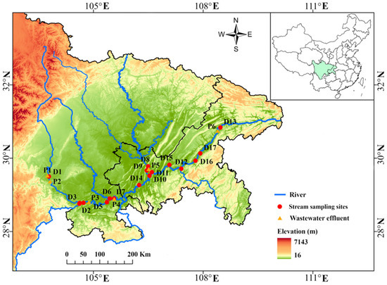 Sampling locations in the Sichuan and Chongqing Reach of Yangtze River. Red dots represent stream sampling sites, and yellow triangles represent wastewater effluent. There were 13 surface water sampling sites (D1–D13) along 2022, and 17 surface water sampling sites (D1–D17) along the 2023.